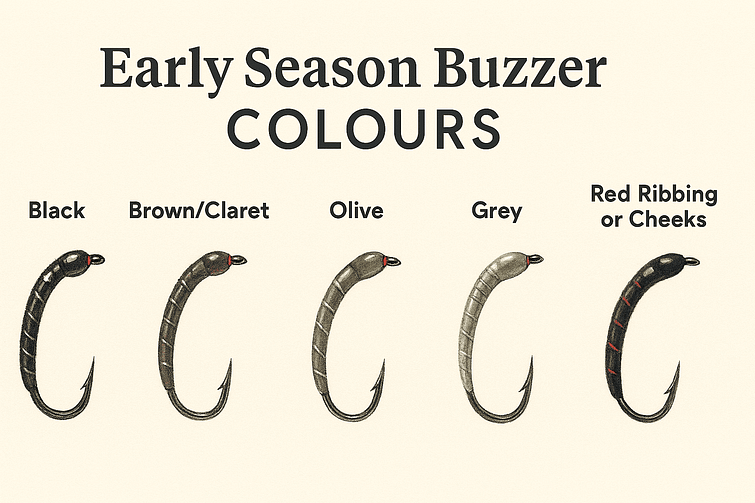- Observe the hatch: Matching the size and colour of buzzers (black, brown, olive, claret) ensures trout arenāt pressured into unnatural feeding responses.